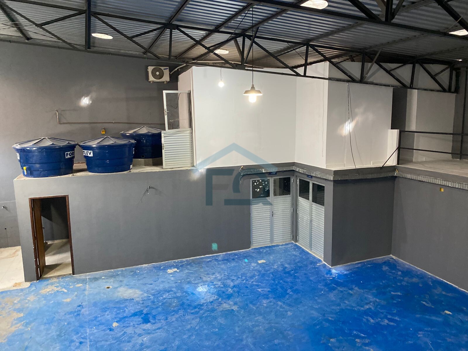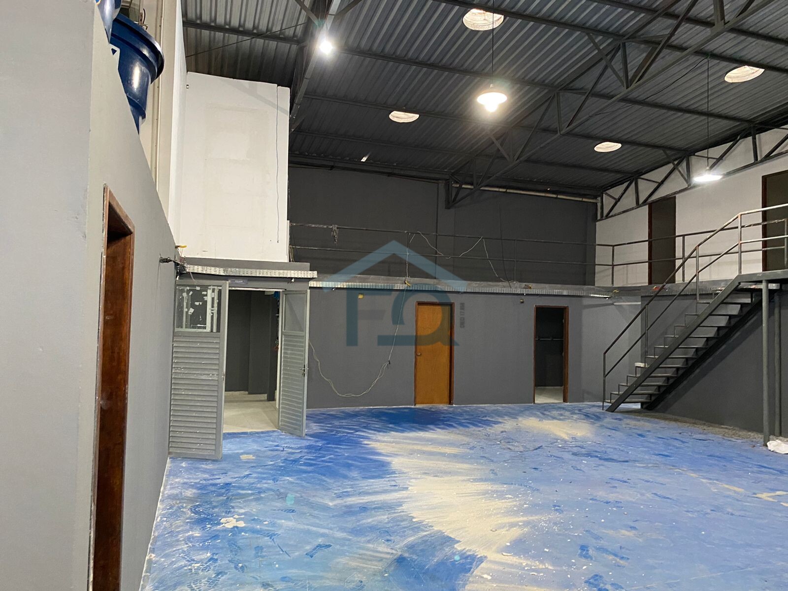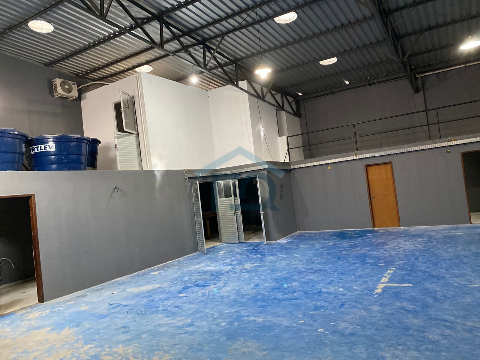 Com 2 pavimentos, com área mais mezanino, 300 m² pavimento térreo e 120 m² pavimento superior, 4,5 pé direito. Telha termo acústica para evitar calor em demasia e ruídos.